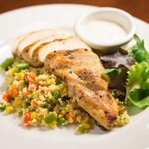 Free Range Chicken Marinated in Homemade Spices and Jalapenoes served with Herb Cous Cous and accompanied with Home Made Tzatziki Sauce, Roasted Mediterranean Salad